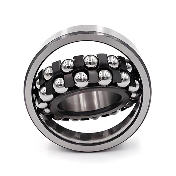 自动调心球轴承的外圈球面滚道中心点与轴承中心点一致。内圈具有双列滚道。旋转时钢球、保持架、内圈对於外圈心轴可作一定程度的自由倾斜。即具有所谓的自动调心性能。因此,可自动调整轴和轴承箱因加工、安装不当发生的轴心偏移。如图1.